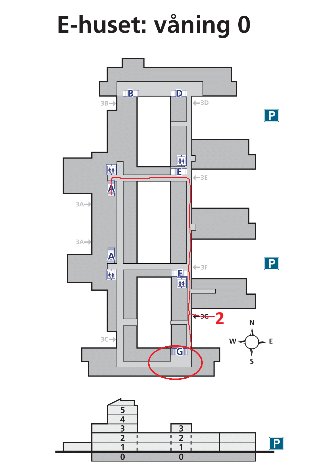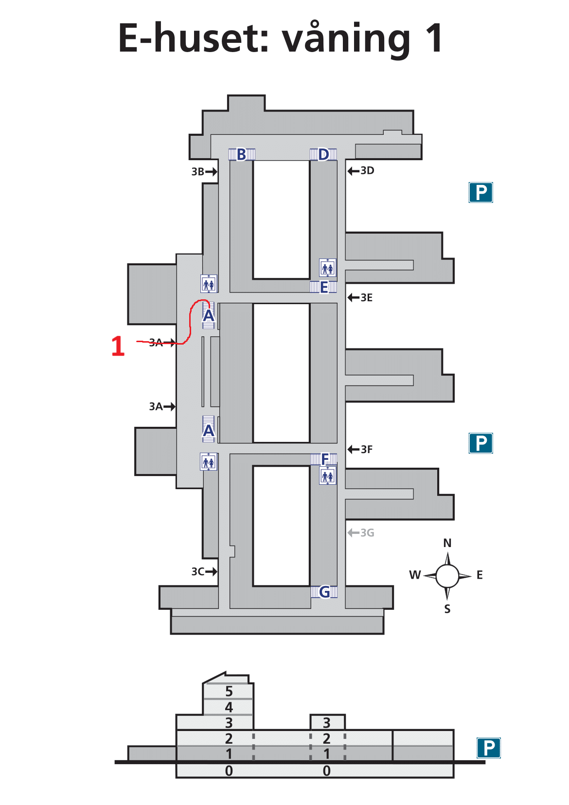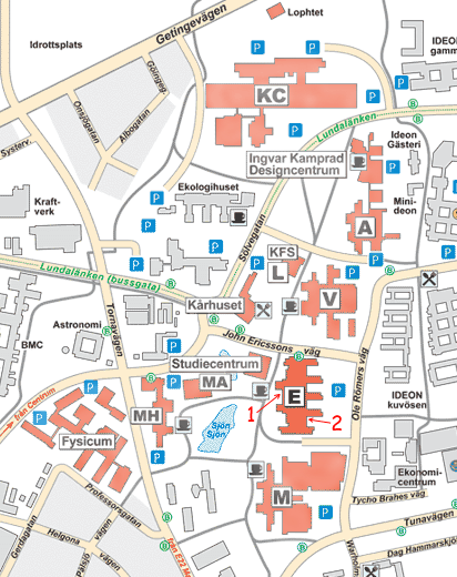 E-huset är (underligt nog) markerat med ett E på kartan. Den röda 1:an markerar huvudingången, och 2:an markerar den ingång som är närmast studierummen som vi träffas vid.
